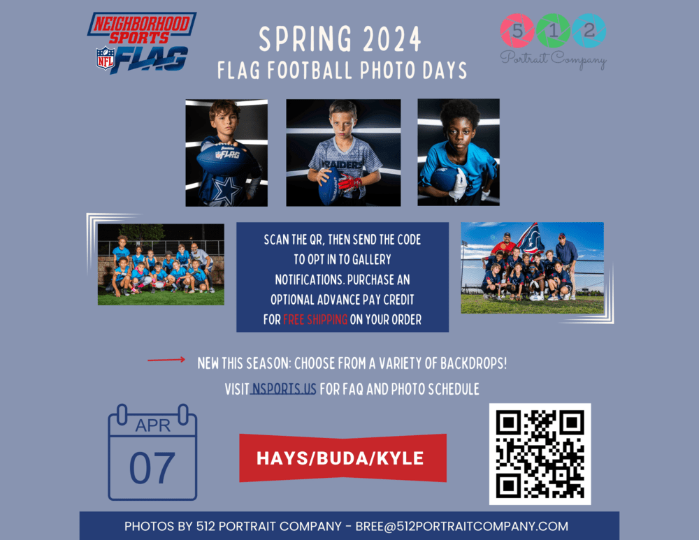 Get ready for your Flag Football Team & Individual photos at this Sunday, April 7th. 512 Portrait Company will be onsite to capture your flag football memories. Photography will take place on 04/07/2024. NO PURCHASE REQUIRED AT TIME OF PICTURES. Purchase options will be available in the gallery 1-2 weeks after the session. HEAD COACHES WILL RECEIVE A COMPLIMENTARY TEAM PORTRAIT.
